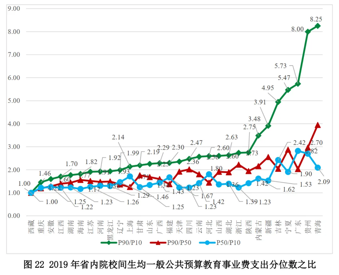 2019年各省份生均一般公共預(yù)算教育事業(yè)費(fèi)支出分位數(shù)之比表明:(1)西藏、重慶、安徽的省內(nèi)均衡性均依然位居前列。(2)青海、貴州、廣東省內(nèi)部生均一般公共預(yù)算教育事業(yè)費(fèi)支出的最高90%院校與最低10%院校差異最大,廣東是由于中位數(shù)與最低10%院校之間差異較大,青海和貴州則是由于最高90%與中位數(shù)院校差異較大,這表明這三個省份內(nèi)部教育財政投入的均衡性不高,且原因不同。(圖22)