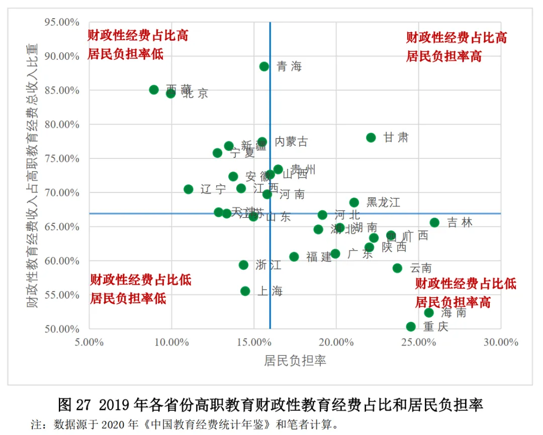 我國各省份高職教育的財政性教育經(jīng)費(fèi)占比與居民負(fù)擔(dān)率呈現(xiàn)出不同類型:(1)第一種類型是財政性教育經(jīng)費(fèi)占比高、居民負(fù)擔(dān)率低,例如青海、西藏、北京等;(2)第二種類型是財政性教育經(jīng)費(fèi)占比低,居民負(fù)擔(dān)率高,例如海南、重慶、云南等;(3)第三種類型是財政性教育經(jīng)費(fèi)占比和居民負(fù)擔(dān)率都高,例如甘肅、貴州、黑龍江等;(4)第四種類型是財政性教育經(jīng)費(fèi)占比和居民負(fù)擔(dān)率都低,例如浙江、上海等省份。(圖27)