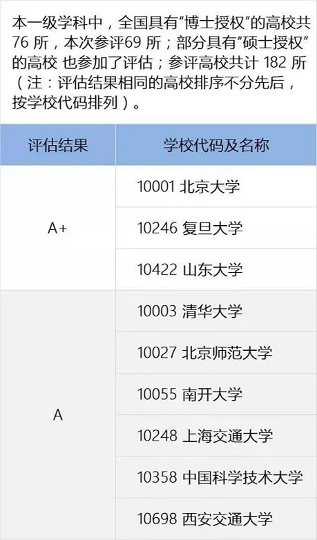 在教育部第四輪數(shù)學一級學科評估中,北京大學,復(fù)旦大學,山東大學3所大學處于A+類。清華大學,北京師范大學,南開大學,上海交通大學,中國科學技術(shù)大學,西安交通大學6所大學處于A類。