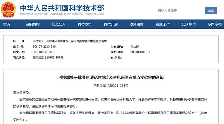 科技部關(guān)于批準(zhǔn)建設(shè)疑難重癥及罕見病國(guó)家重點(diǎn)實(shí)驗(yàn)室的通知