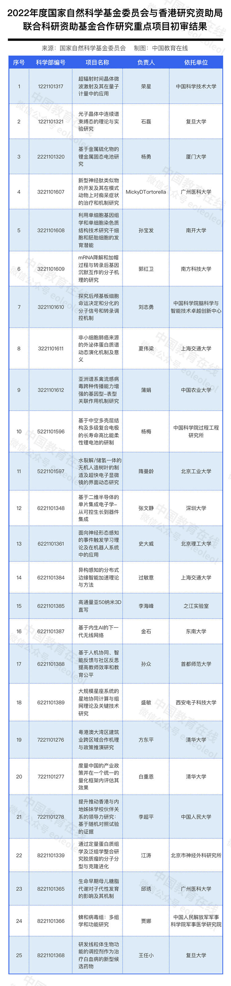 經(jīng)過公開征集,2022年度共收到NSFC與RGC合作研究重點項目申請25份。經(jīng)初步審查并與RGC核對清單,確定有效申請25份。