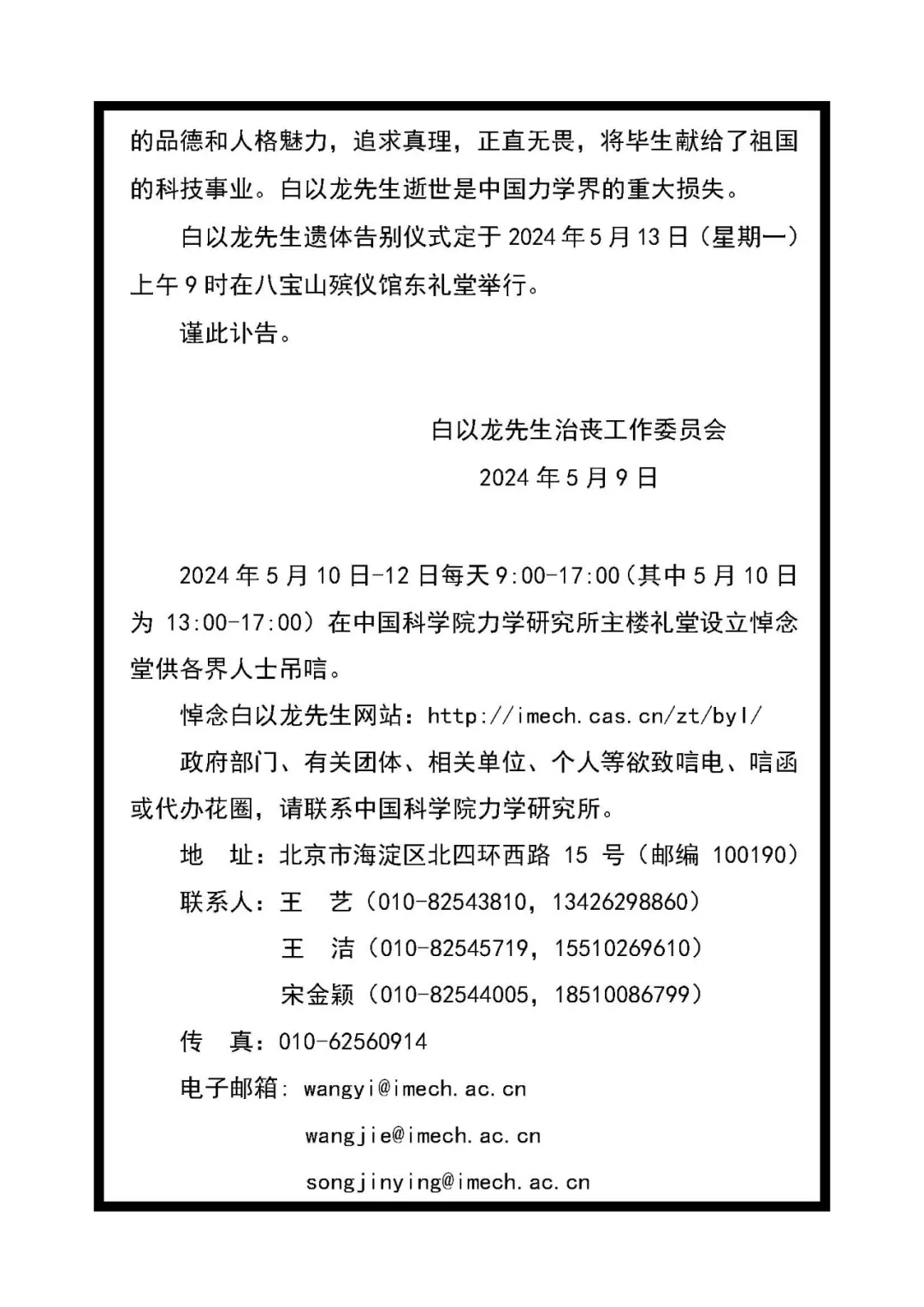 中國科學(xué)院力學(xué)所5月9日發(fā)布訃告:中國著名力學(xué)家,中國科學(xué)院院士、歐洲科學(xué)院院士,第十、十一屆全國政協(xié)委員,中國科學(xué)院力學(xué)研究所原副所長、中國力學(xué)學(xué)會原理事長白以龍研究員,因病于當(dāng)天上午在北京逝世,享年83歲。