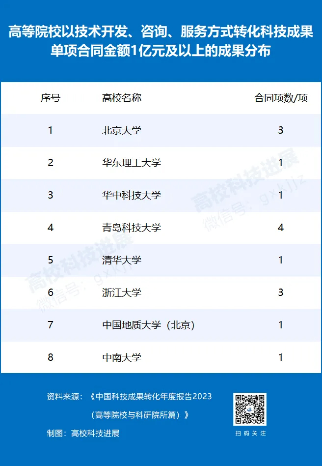2022年,高等院校以技術開發(fā)、咨詢、服務方式轉化科技成果單項合同金額1億元及以上的合同有15項,其中青島科技大學4項,北京大學和浙江大學均有3項,華東理工大學、華中科技大學、清華大學、中國地質大學(北京)、中南大學各1項。