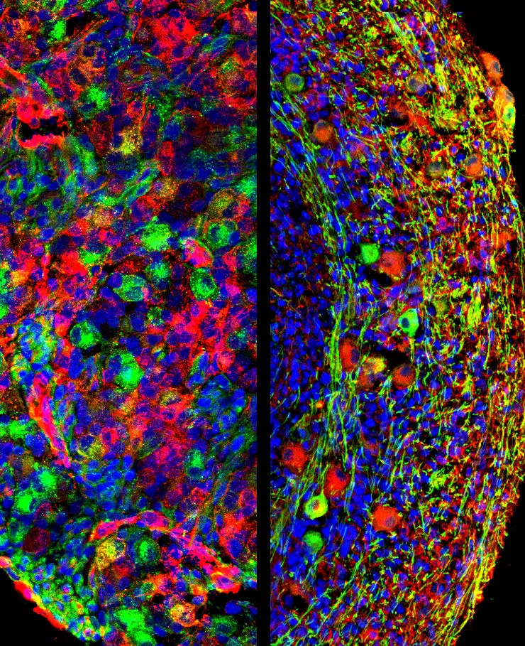 圖為人類背根結(jié)節(jié)(左)和人類背根結(jié)節(jié)類器官(右)的細(xì)胞組成對(duì)比圖。(受訪者供圖)