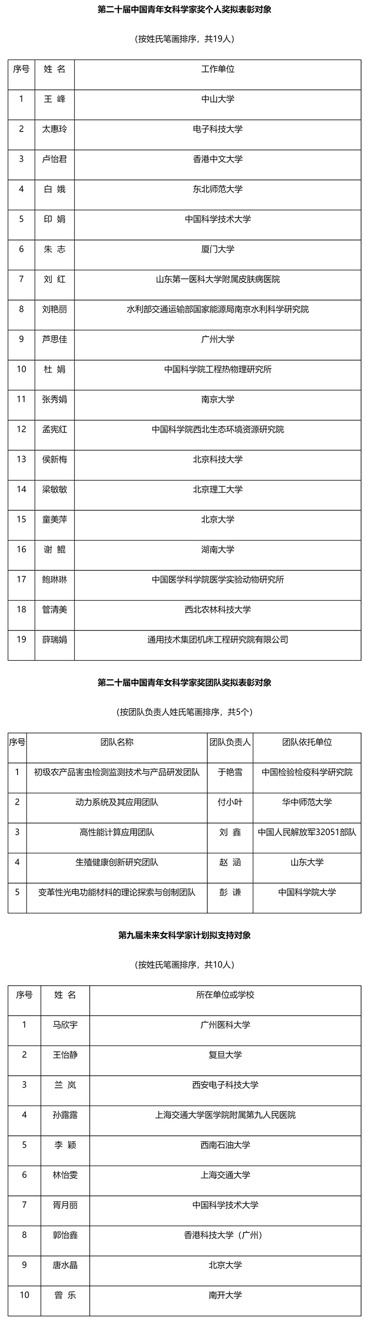 經(jīng)評(píng)審,共產(chǎn)生第二十屆中國(guó)青年女科學(xué)家獎(jiǎng)19名擬表彰人選、5個(gè)擬表彰團(tuán)隊(duì)和10名第九屆未來女科學(xué)家計(jì)劃擬支持對(duì)象。公示時(shí)間從2025年1月2日起,至2025年1月8日止。