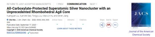 近日,寧夏大學(xué)寧夏光伏材料重點實驗室劉寬冠副教授團隊在銀納米團簇化學(xué)研究領(lǐng)域取得重要科研進展。劉寬冠以第一作者兼通訊作者在化學(xué)領(lǐng)域國際頂尖期刊《Journal of the American Chemical Society》(美國化學(xué)會志,以下簡稱JACS)上發(fā)表了題為“All-Carboxylate-Protected Superatomic Silver Nanocluster with an Unprecedented Rhombohedral Ag8 Core”的研究論文,寧夏大學(xué)為第一單位。