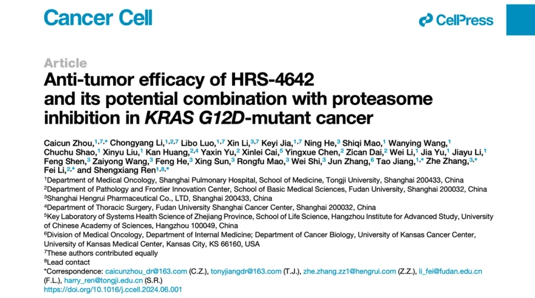醫(yī)學(xué)院、附屬上海市肺科醫(yī)院任勝祥、周彩存團(tuán)隊(duì)研發(fā)了首個(gè)臨床有效KRAS G12D特異性抑制劑——HRS-4642,通過(guò)體內(nèi)外聯(lián)合給藥實(shí)驗(yàn)明確了其與蛋白酶體抑制劑聯(lián)合的治療新策略。研究團(tuán)隊(duì)還通過(guò)流式細(xì)胞術(shù)、免疫組化等發(fā)現(xiàn)了HRS-4642單藥或聯(lián)合治療效用,為KRAS G12D腫瘤靶免聯(lián)合提供了理論基礎(chǔ)。該研究成果發(fā)表于《癌細(xì)胞》(Cancer Cell)。