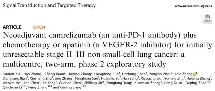 肺癌是全球發(fā)病和死亡人數(shù)最多的惡性腫瘤,其中非小細(xì)胞肺癌占比約85%。醫(yī)學(xué)院、附屬上海市肺科醫(yī)院胸外科姜格寧、張鵬團(tuán)隊(duì)聯(lián)合市內(nèi)六家醫(yī)療單位共同開(kāi)展了一項(xiàng)名為L(zhǎng)ungMate 003的多中心、雙臂、開(kāi)放、Ⅱ期臨床研究,旨在探究新輔助卡瑞利珠單抗聯(lián)合化療或阿帕替尼治療初始不可切除非小細(xì)胞肺癌患者的安全性和有效性。該研究成果發(fā)表于《信號(hào)轉(zhuǎn)導(dǎo)與靶向治療》(Signal Transduction and Targeted Therapy)。
