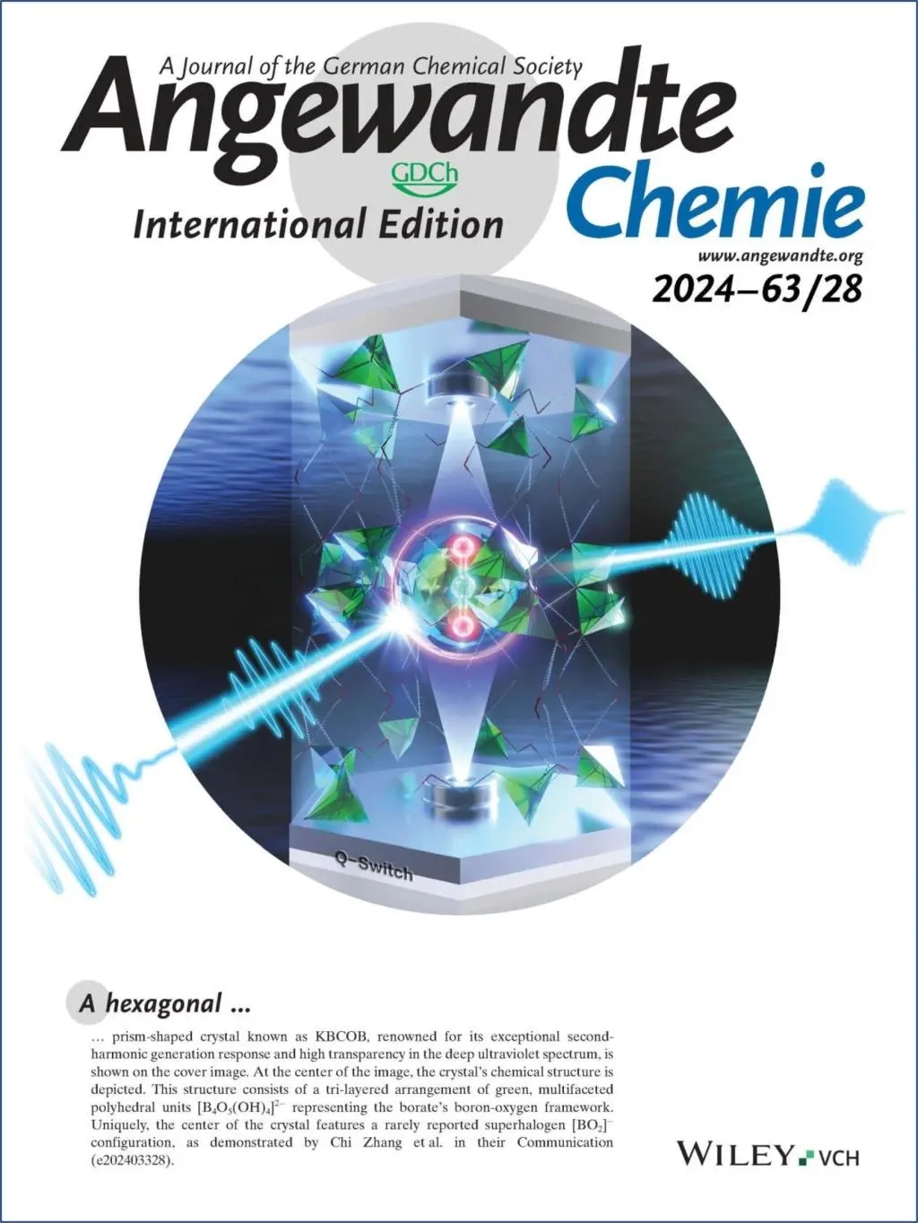 化學(xué)科學(xué)與工程學(xué)院張弛研究團(tuán)隊(duì)以鹵代氧化物為研究對(duì)象,提出了一種超鹵素取代設(shè)計(jì)方法,研制了首例含有[BO2]基元的深紫外透過(guò)的氧化物晶體材料K9[B4O5(OH)4]3(CO3)(BO2)·7H2O (KBCOB),探討并闡明了多種π共軛陰離子基元對(duì)晶體材料光學(xué)帶隙、倍頻效應(yīng)以及雙折射率的影響規(guī)律。相關(guān)成果發(fā)表于《德國(guó)應(yīng)用化學(xué)》(Angewandte Chemie International Edition),并被遴選為封面文章。