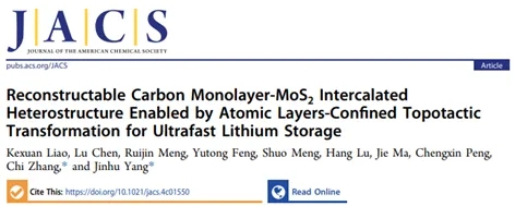 二維材料的插層結(jié)構(gòu)設(shè)計(jì)對(duì)發(fā)展快速充電鋰離子電池具有重要意義?;瘜W(xué)科學(xué)與工程學(xué)院楊金虎與張弛團(tuán)隊(duì)設(shè)計(jì)了一種單層碳插層在二硫化鉬范德華層間的異質(zhì)結(jié)構(gòu)材料,作為負(fù)極材料在鋰離子電池儲(chǔ)能過(guò)程中具有獨(dú)特的“原子層限域拓?fù)浞磻?yīng)”和可逆重構(gòu)的特性,并展現(xiàn)出了超快充性能。相關(guān)研究成果發(fā)表于《美國(guó)化學(xué)會(huì)志》(Journal of the American Chemical Society)。