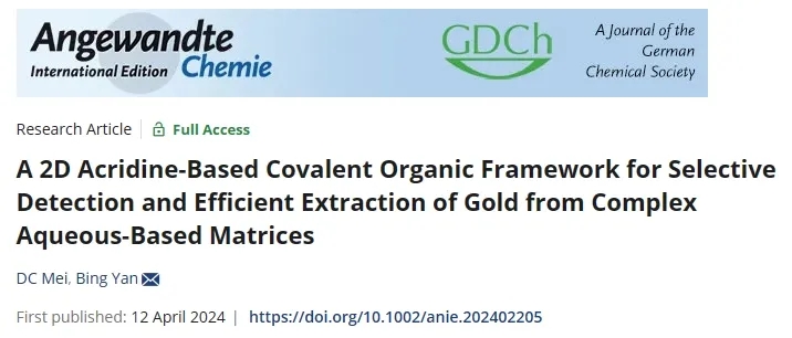 金作為最重要的金屬之一,在電子、航空航天和化學(xué)催化等重要領(lǐng)域都具有不可替代的地位?;瘜W(xué)科學(xué)與工程學(xué)院閆冰團(tuán)隊(duì)合成了一例亞胺鍵連接的吖啶基共價(jià)有機(jī)框架(COF)材料,該材料能夠作為新型探針實(shí)現(xiàn)對(duì)金離子的選擇性熒光傳感、比色傳感和高效的提取。相關(guān)研究成果在線發(fā)表于《德國(guó)應(yīng)用化學(xué)》(Angewandte Chemie International Edition)。