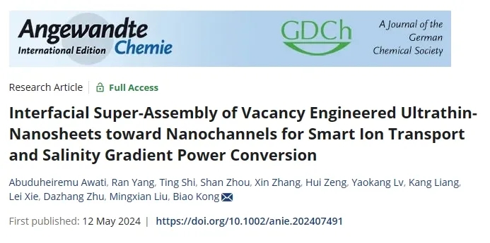 滲透能作為一種“藍(lán)色能源”,即利用淡水和含鹽水之間的離子濃度差異來(lái)獲取能量,被認(rèn)為是解決能源危機(jī)和環(huán)境問(wèn)題的潛在方案。化學(xué)科學(xué)與工程學(xué)院劉明賢課題組提出了一種基于缺陷工程調(diào)控表面電荷策略,通過(guò)界面超組裝智能調(diào)控離子傳輸,實(shí)現(xiàn)了滲透能發(fā)電。近日,相關(guān)研究成果發(fā)表于《德國(guó)應(yīng)用化學(xué)》(Angewandte Chemie International Edition)。