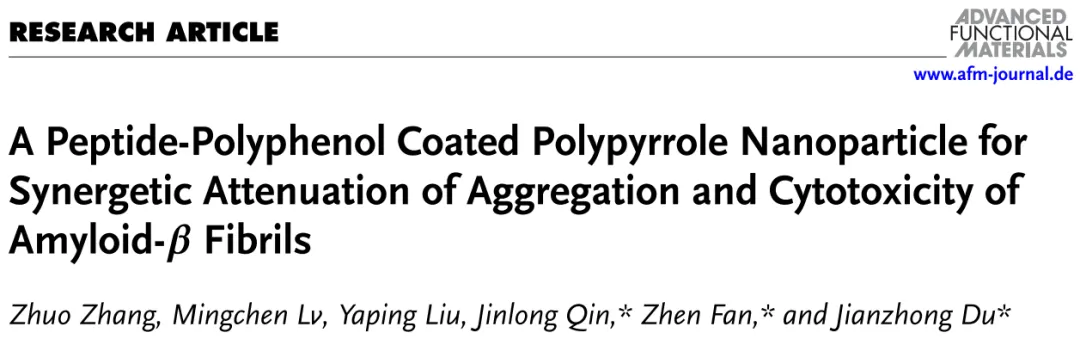 如何有效抑制大腦中β-淀粉樣蛋白(amyloid-β protein,Aβ)的聚集并解離已經(jīng)聚集的Aβ斑塊,是阿爾茨海默病治療領(lǐng)域的關(guān)鍵科學(xué)問(wèn)題。材料科學(xué)與工程學(xué)院杜建忠/范震課題組設(shè)計(jì)并制備了一種具有多肽-多酚殼層的近紅外光響應(yīng)性納米顆粒,能夠有效促進(jìn)和加速Aβ纖維的解離。該研究成果發(fā)表于《先進(jìn)功能材料》(Advanced Functional Materials)。