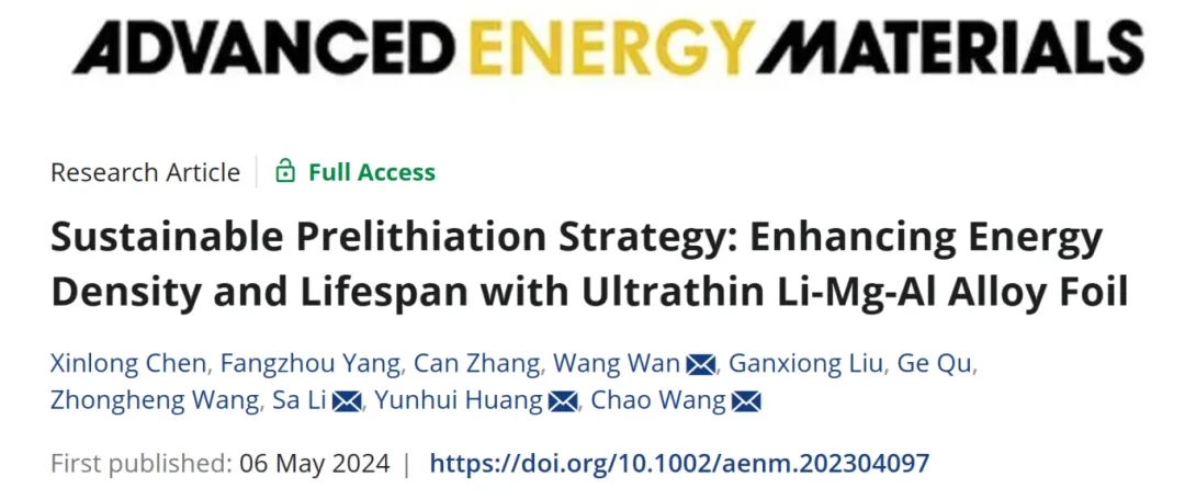 材料科學(xué)與工程學(xué)院王超團(tuán)隊(duì)基于儲(chǔ)能型磷酸鐵鋰石墨電池體系,使用自制超薄鋰鎂鋁合金實(shí)現(xiàn)無(wú)損高效的接觸預(yù)鋰化,并提出了能夠不斷補(bǔ)充電池循環(huán)過(guò)程中鋰損失的持續(xù)補(bǔ)鋰設(shè)計(jì)原則?;诖朔椒ǎ?000圈后電池容量提升了32.4%,電池預(yù)期循環(huán)壽命能延長(zhǎng)至對(duì)照組的3倍。研究成果發(fā)表于《先進(jìn)能源材料》(Advanced Energy Materials)。