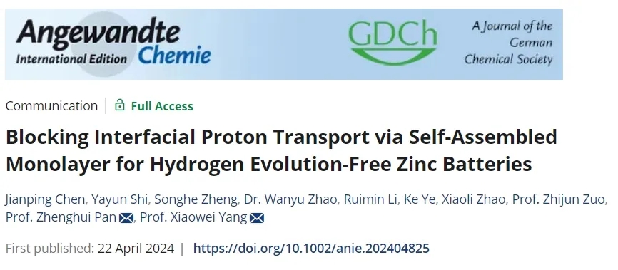 水系鋅離子電池是有前途的下一代儲(chǔ)能設(shè)備,但存在析氫反應(yīng)(HER)和鋅負(fù)極表面復(fù)雜的副反應(yīng)等問(wèn)題。材料科學(xué)與工程學(xué)院新能源材料化工團(tuán)隊(duì)(潘爭(zhēng)輝、楊曉偉)通過(guò)在Ti3C2Tx(MXene)基底上錨定離子液體陽(yáng)離子(BMIM+)構(gòu)建了自組裝的單分子層(SAM),以實(shí)現(xiàn)無(wú)HER的穩(wěn)定鋅負(fù)極。相關(guān)研究成果發(fā)表于《德國(guó)應(yīng)用化學(xué)》(Angewandte Chemie International Edition)。