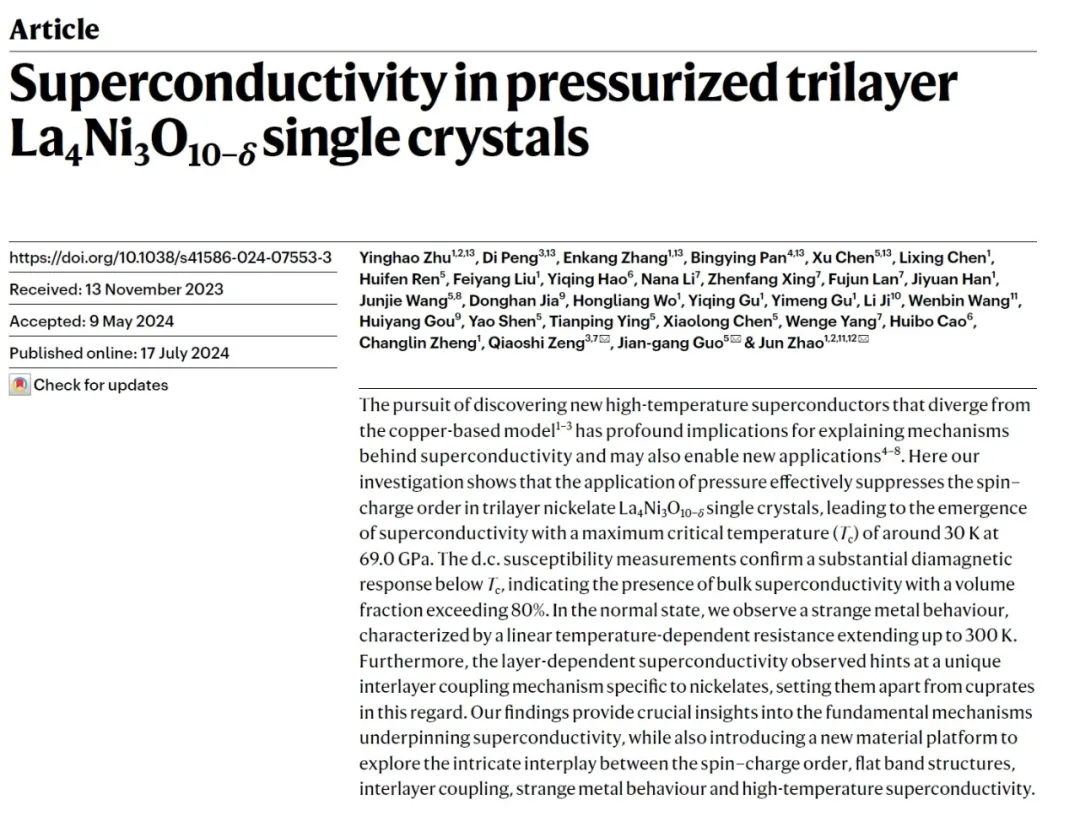 北京時(shí)間7月17日晚,該研究成果以“Superconductivity in pressurized trilayer La4Ni3O10-δ single crystals”為題發(fā)表于最新一期的《自然》(Nature)上。Nature同期在“新聞和觀點(diǎn)”(News&Views)專欄以“The search for superconductivity widens”為題對該文進(jìn)行亮點(diǎn)推薦和介紹。