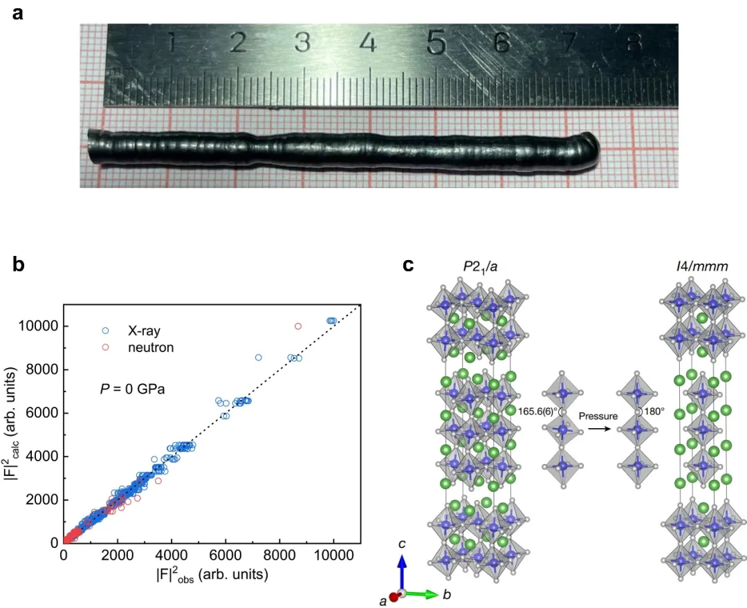 (a)La4Ni3O10-δ單晶樣品照片;(b)中子和X-ray單晶衍射數(shù)據(jù);(c)壓力下晶格結(jié)構(gòu)的演變