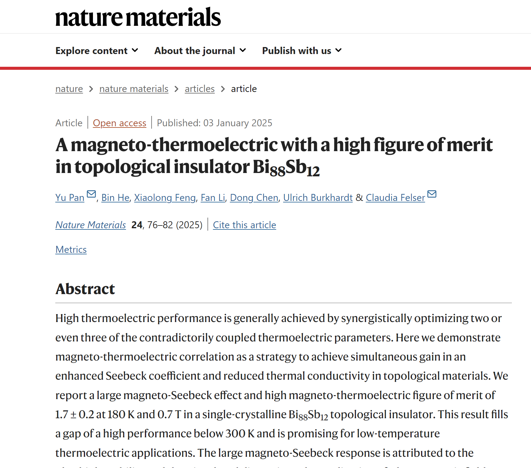北京時間2025年1月3日,重慶大學(xué)前沿交叉學(xué)科研究院量子材料與器件研究中心、材料科學(xué)與工程學(xué)院潘瑜教授在國際頂級期刊《自然材料》(Nature Materials)發(fā)表最新研究成果。論文題目為《具有優(yōu)異磁-熱電優(yōu)值的Bi88Sb12拓撲絕緣體》(A magneto-thermoelectric with a high figure of merit in topological insulator Bi88Sb12 )。潘瑜教授為第一作者、通訊作者,重慶大學(xué)為第二完成單位、通訊單位,德國馬普固體化學(xué)物理研究所為第一完成單位,合作單位還包括馬普微結(jié)構(gòu)物理研究所、重慶大學(xué)物理學(xué)院。