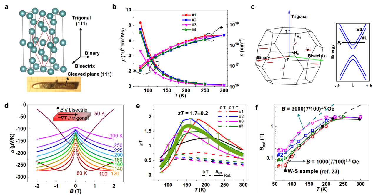 圖1 (a) 晶體結(jié)構(gòu)與單晶照片,(b)遷移率與載流子濃度,(c)費米面分布與能帶劈裂示意圖,(d)磁-塞貝克系數(shù),(e)zT值,(f)最佳磁場與溫度的依賴關(guān)系。