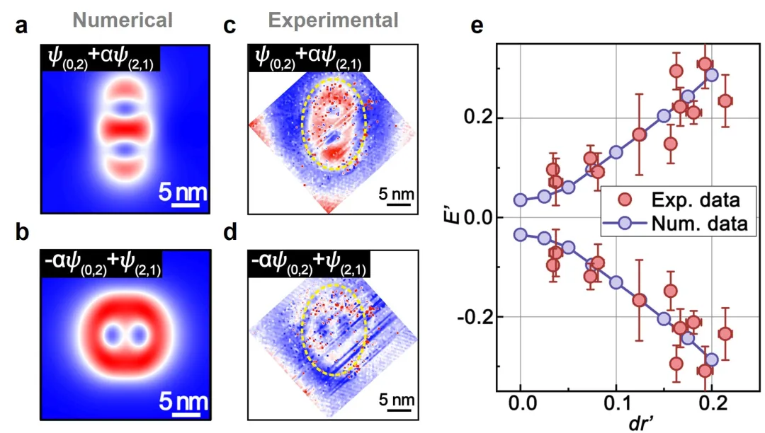 該研究指出,如果在石墨烯量子點(diǎn)中將圓形勢(shì)場(chǎng)變形為橢圓形勢(shì)場(chǎng),軌道量子數(shù)為0的s軌道和軌道量子數(shù)為2的d軌道之間將會(huì)發(fā)生雜化,重新組合成兩個(gè)新的雜化態(tài)。孫慶豐教授課題組從解析推導(dǎo)和數(shù)值計(jì)算兩方面得到了雜化態(tài)的形狀(圖2a,b,θ形和倒θ形)。何林教授課題組在實(shí)驗(yàn)上利用掃描隧道顯微鏡(STM)針尖操縱技術(shù),開發(fā)了制備具有不同各向異性程度量子點(diǎn)的方法,并對(duì)其中的受限態(tài)進(jìn)行了系統(tǒng)探測(cè),直接觀測(cè)到了量子點(diǎn)受限態(tài)的軌道雜化特征(圖2c,d)。
