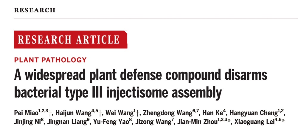 2025年2月28日,北京大學(xué)化學(xué)與分子工程學(xué)院/北大-清華生命科學(xué)聯(lián)合中心雷曉光教授團(tuán)隊(duì)聯(lián)合中國(guó)科學(xué)院遺傳發(fā)育所/崖州灣國(guó)家實(shí)驗(yàn)室周儉民研究員團(tuán)隊(duì)在Science上發(fā)表了題為“A widespread plant defense compound disarms bacterial type III injectisome assembly”的研究論文(Science 2025, 387, eads0377),首次揭示了一類植物內(nèi)源存在的、具有作用機(jī)制獨(dú)特、廣譜抗菌活性的天然產(chǎn)物分子——芥酸酰胺。研究表明,芥酸酰胺通過特異性破壞植物病原細(xì)菌的三型分泌系統(tǒng)(T3SS)組裝,有效抑制其致病力,從而實(shí)現(xiàn)對(duì)多種細(xì)菌侵染的廣譜抑制作用。這一機(jī)制體現(xiàn)了“不戰(zhàn)而屈人之兵”的創(chuàng)新抗菌策略,與傳統(tǒng)抗生素藥物相比具有顯著優(yōu)勢(shì):芥酸酰胺不直接殺滅細(xì)菌,而是選擇性地降低病原菌的致病力,這種獨(dú)特的作用模式不僅確保了更高的生物安全性,還顯著減少了對(duì)環(huán)境的污染風(fēng)險(xiǎn),同時(shí)有效規(guī)避了細(xì)菌耐藥性的產(chǎn)生。這一重大科學(xué)發(fā)現(xiàn)為新型生物農(nóng)藥的研發(fā)開辟了全新路徑,對(duì)推動(dòng)綠色農(nóng)業(yè)可持續(xù)發(fā)展具有重要的理論和實(shí)踐意義。
