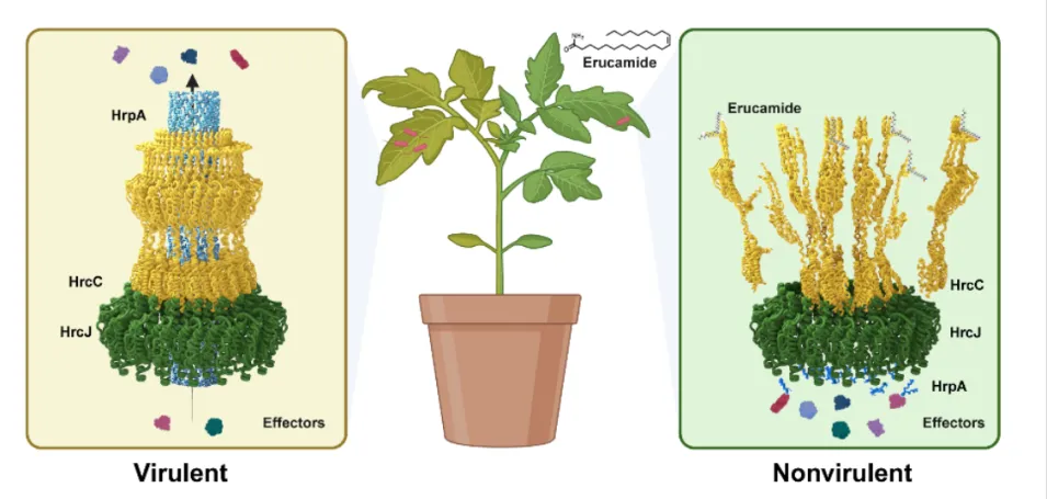研究發(fā)現(xiàn),芥酸酰胺能夠靶向破壞病原細(xì)菌的關(guān)鍵致病裝置——三型分泌系統(tǒng)(Type III secretion system, T3SS)。T3SS是許多動(dòng)植物病原細(xì)菌用于向宿主細(xì)胞分泌毒性效應(yīng)蛋白的核心裝置,對(duì)細(xì)菌致病性至關(guān)重要。通過遺傳學(xué)實(shí)驗(yàn),研究團(tuán)隊(duì)證實(shí)芥酸酰胺的積累是植物實(shí)現(xiàn)對(duì)病原細(xì)菌免疫的關(guān)鍵機(jī)制。進(jìn)一步的研究揭示,芥酸酰胺與T3SS的重要組分HrcC蛋白特異性結(jié)合,干擾其在病原細(xì)菌外膜上的正確定位,從而有效抑制T3SS的組裝,使病原細(xì)菌失去致病能力。