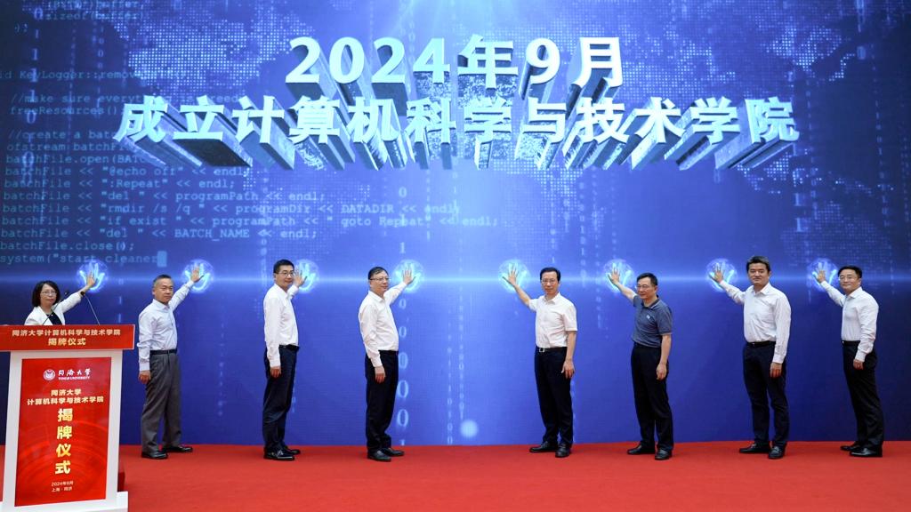 同濟(jì)大學(xué)黨委書記方守恩,校長、中國工程院院士鄭慶華,上海市教衛(wèi)工作黨委副書記、上海市教育委員會副主任顧紅亮,上海市科學(xué)技術(shù)委員會副局長級干部謝文瀾,上海市經(jīng)濟(jì)和信息化委員會二級巡視員劉益平,上海市嘉定區(qū)副區(qū)長魏曉棟,以及同濟(jì)大學(xué)計(jì)算機(jī)科學(xué)與技術(shù)學(xué)院黨委書記熊嵐、院長申恒濤共同揭牌。