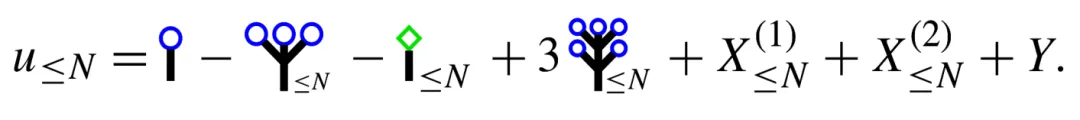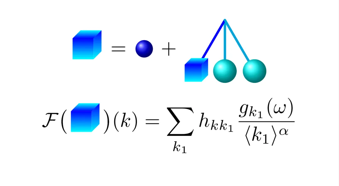 隨后,上述三位作者與合作者普林斯頓大學(xué) B. Bringmann解決了前述第二個(gè)難題,即三維三階非線性波方程的吉布斯測(cè)度的不變性問(wèn)題,成果發(fā)表在今年4月29日出版的《數(shù)學(xué)新進(jìn)展》上。前述概率臨界猜想為解決該難題提供了深刻的洞見(jiàn)。在這篇長(zhǎng)達(dá) 279 頁(yè)的論文中,岳海天與合作者創(chuàng)造性地運(yùn)用了概率論、調(diào)和分析、數(shù)論、組合數(shù)學(xué)、偏微分方程等數(shù)學(xué)分支中的隨機(jī)量子化、擬控制理論、格點(diǎn)計(jì)數(shù)估計(jì)、隨機(jī)張量理論、分子圖分析等多種復(fù)雜技術(shù)工具從而證明了在吉布斯概率初值下三維三階波方程會(huì)按照既定結(jié)構(gòu)演化 (見(jiàn)圖2 )。
