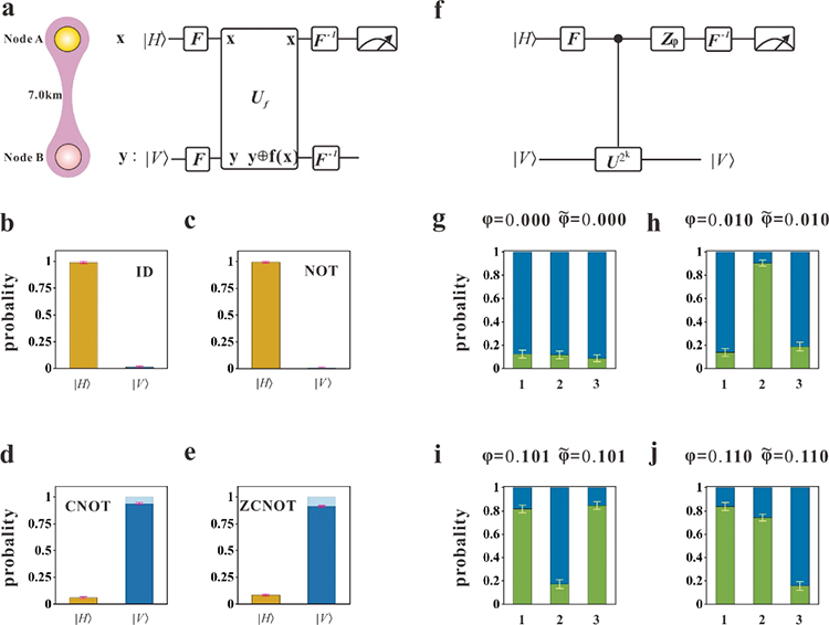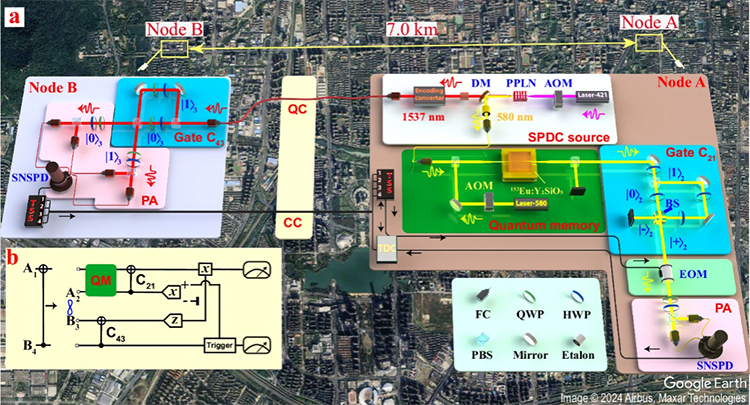 在該工作中,研究團(tuán)隊(duì)基于量子門隱形傳送協(xié)議來建立兩個(gè)量子節(jié)點(diǎn)之間的非局域量子門。兩個(gè)量子節(jié)點(diǎn)之間的直線距離為7公里,分別位于中國科學(xué)技術(shù)大學(xué)東校區(qū)(簡稱中國科大)和合肥市大蜀山東側(cè)(簡稱大蜀山)。研究團(tuán)隊(duì)首先在兩節(jié)點(diǎn)間使用通信波段光子和專線光纜進(jìn)行了量子糾纏態(tài)的遠(yuǎn)程分發(fā)。隨后,中國科大節(jié)點(diǎn)和大蜀山節(jié)點(diǎn)分別執(zhí)行本地的兩比特量子門操作。中國科大節(jié)點(diǎn)采用摻銪硅酸釔晶體實(shí)現(xiàn)糾纏光子的存儲(chǔ),直到接收到大蜀山節(jié)點(diǎn)的測(cè)量結(jié)果,并根據(jù)這一結(jié)果執(zhí)行相應(yīng)的單比特門操作。