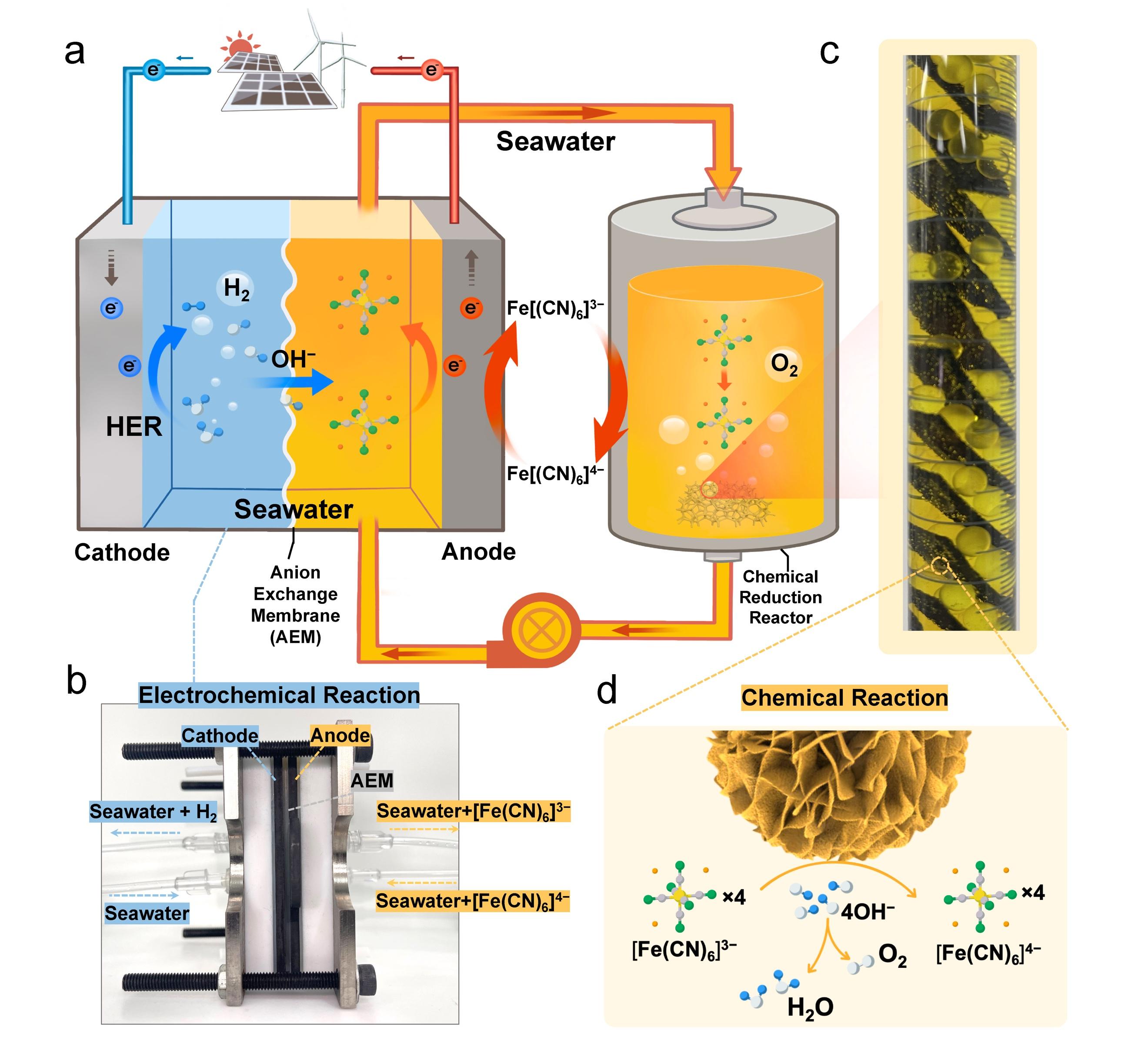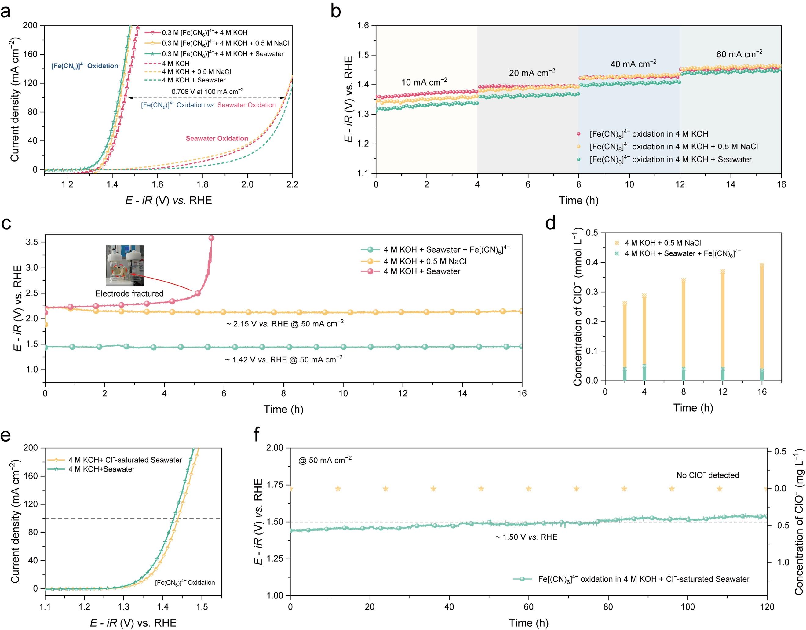 不同于2022年11月謝和平院士團(tuán)隊(duì)Nature正刊上提出的相變遷移海水直接電解制氫顛覆性原理技術(shù),該研究是謝和平院士團(tuán)隊(duì)圍繞海水中的氯離子引發(fā)副反應(yīng)和電極腐蝕現(xiàn)象,提出的另一種新的解耦式海水直接電解制氫策略。論文系統(tǒng)研究了鐵氰酸根/亞鐵氰酸根電對(duì)([Fe(CN)6]3?/4?)在真實(shí)海水體系下可逆氧化還原特性,探明了電解系統(tǒng)陰極析氫反應(yīng)與陽極亞鐵氰酸根氧化反應(yīng)的高效性,厘清了解耦體系下氧氣自發(fā)穩(wěn)定產(chǎn)出的反應(yīng)機(jī)理,實(shí)現(xiàn)了全新系統(tǒng)在真實(shí)海水環(huán)境下250小時(shí)的長(zhǎng)時(shí)間穩(wěn)定。該項(xiàng)原理技術(shù)巧妙規(guī)避了海水中氯離子對(duì)電解制氫反應(yīng)的干擾,充分驗(yàn)證了解耦式海水直接電解制氫系統(tǒng)在復(fù)雜海水環(huán)境下的抗腐蝕性與對(duì)氯離子副反應(yīng)的應(yīng)用潛力,將有助于豐富和進(jìn)一步構(gòu)建破解海水復(fù)雜成分影響的海水電解制氫理論體系和技術(shù)框架。