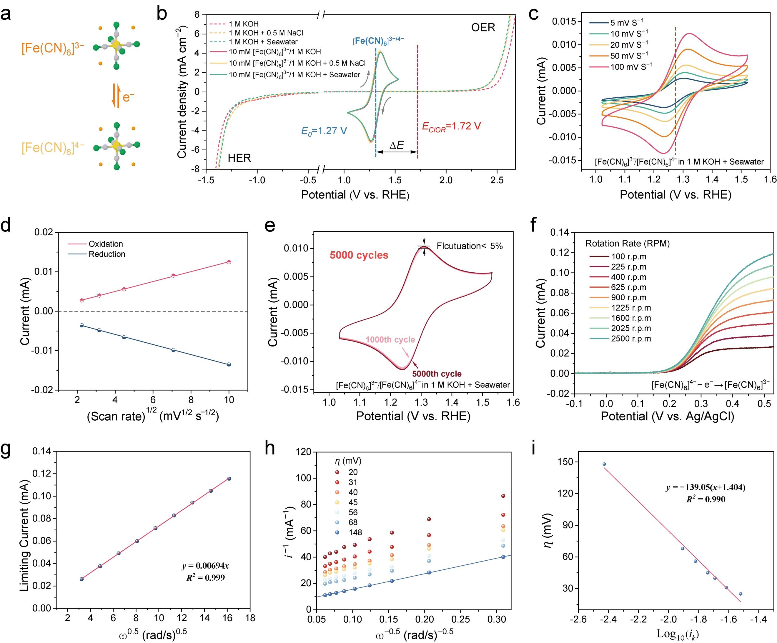 該研究針對(duì)海水制氫中最棘手的氯離子干擾難題,引入氧化還原介導(dǎo)的解耦策略,利用兼具熱力學(xué)和動(dòng)力學(xué)優(yōu)勢(shì)的陽極反應(yīng),巧妙規(guī)避了傳統(tǒng)電解水制氫過程中析氧反應(yīng)與氯離子反應(yīng)的直接競(jìng)爭(zhēng),大幅降低了電化學(xué)腐蝕。在該研究中,[Fe(CN)6]3?/4?電對(duì)在在海水中不僅保持了優(yōu)異的可逆氧化還原動(dòng)力學(xué)特性,而且在200 mA cm?2的接近工業(yè)級(jí)電流密度下實(shí)現(xiàn)了超過250小時(shí)的長(zhǎng)時(shí)間穩(wěn)定運(yùn)行。