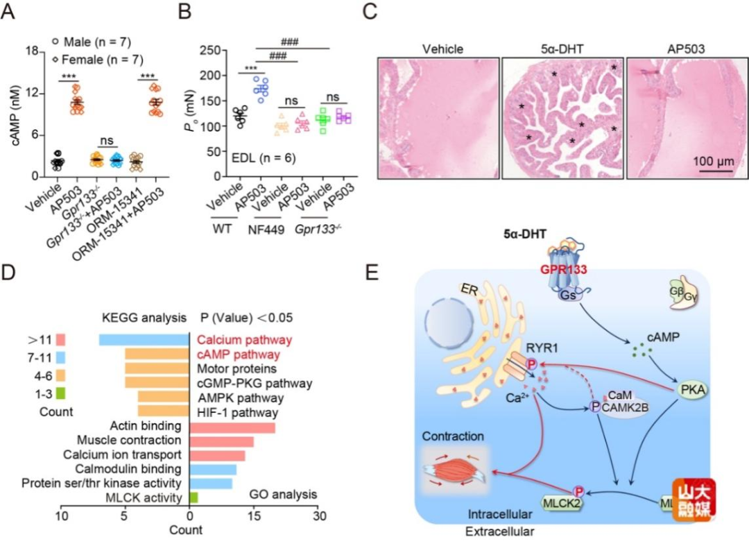1月30日,山東大學(xué)基礎(chǔ)醫(yī)學(xué)院孫金鵬教授團(tuán)隊(duì),聯(lián)合德國(guó)萊比錫大學(xué)Ines Liebscher教授團(tuán)隊(duì),山東大學(xué)易凡教授團(tuán)隊(duì)、肖鵬教授團(tuán)隊(duì)和于曉教授團(tuán)隊(duì),在《細(xì)胞》(Cell)在線發(fā)表了研究論文“Identification, structure and agonist design of an androgen membrane receptor”。研究團(tuán)隊(duì)篩選鑒定了雄激素5α-DHT的膜受體GPR133/ADGRD1,闡明了其在骨骼肌中的調(diào)控作用及分子機(jī)制,并發(fā)展了特異性GPR133的小分子配體,為高效安全的雄激素替代藥物開(kāi)發(fā)提供了全新思路。