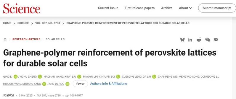 北京時(shí)間3月7日凌晨,華東理工大學(xué)材料學(xué)院清潔能源材料與器件團(tuán)隊(duì)侯宇教授、楊雙教授等人在Science(《科學(xué)》)發(fā)表題為“Graphene-polymer reinforcement of perovskite lattices for durable solar cells”的最新研究成果。該研究發(fā)現(xiàn)了鈣鈦礦光伏不穩(wěn)定性的關(guān)鍵機(jī)制——光機(jī)械誘導(dǎo)分解效應(yīng),提出石墨烯-聚合物機(jī)械增強(qiáng)鈣鈦礦材料的新方法,制備的太陽(yáng)能電池器件在標(biāo)準(zhǔn)太陽(yáng)光照及高溫下的T97工作壽命創(chuàng)下3670小時(shí)新紀(jì)錄,該研究成果將為鈣鈦礦太陽(yáng)電池的產(chǎn)業(yè)化應(yīng)用提供全新解決方案。