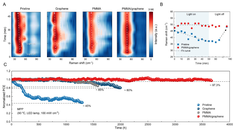 圖3. 石墨烯-聚合物耦合界面實(shí)現(xiàn)鈣鈦礦太陽(yáng)能電池工況壽命的新突破