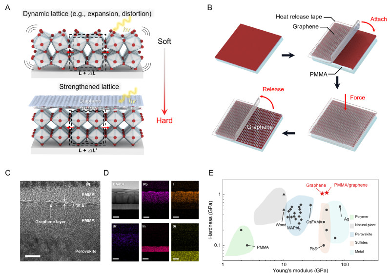 石墨烯具有超高模量(約1 TPa),是鈣鈦礦材料模量的50~100倍,且具有均勻致密、耐機(jī)械疲勞和化學(xué)穩(wěn)定的優(yōu)點(diǎn)。有沒(méi)有可能借用石墨烯這個(gè)“外援”,來(lái)提升鈣鈦礦的穩(wěn)定性呢?然而,石墨烯與鈣鈦礦并不兼容,如何實(shí)現(xiàn)是一大難題。