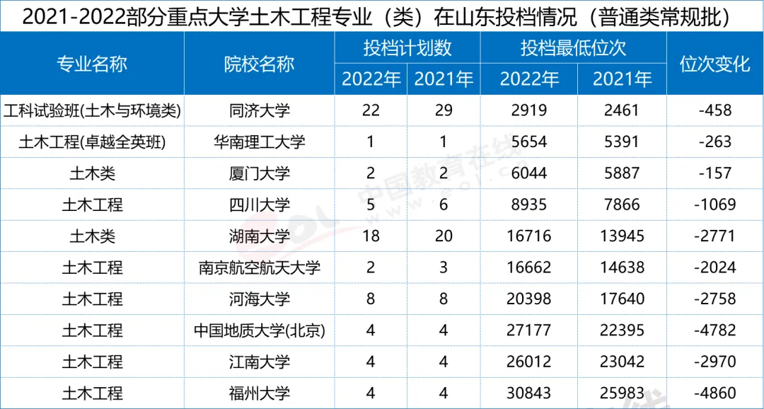根據(jù)中國教育在線發(fā)布的《2023高招調(diào)查報(bào)告》,全國范圍大部分高校土木專業(yè)分?jǐn)?shù)都出現(xiàn)了明顯的滑坡,錄取分?jǐn)?shù)(位次)出現(xiàn)了不同程度的下跌。同濟(jì)大學(xué)在山東的錄取位次下跌了400多,中國地質(zhì)大學(xué)(北京)在招生總量未變的情況下,錄取考生的位次下跌了近5000個(gè)位次,四川大學(xué)與湖南大學(xué)則分別下跌1069和2771個(gè)位次。
