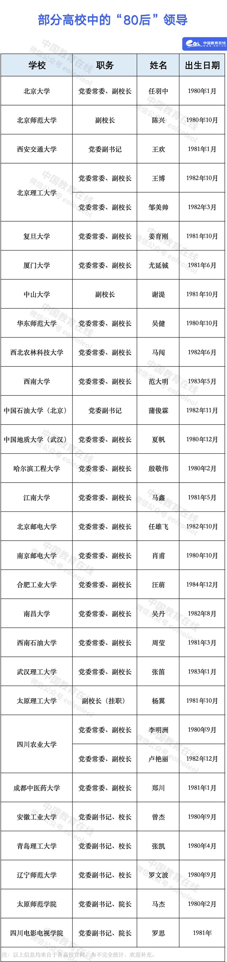 4、目前公開報(bào)道的80后高校領(lǐng)導(dǎo),副職居多,雙一流高校及頂尖高校,尚無80后正職校長(zhǎng)。