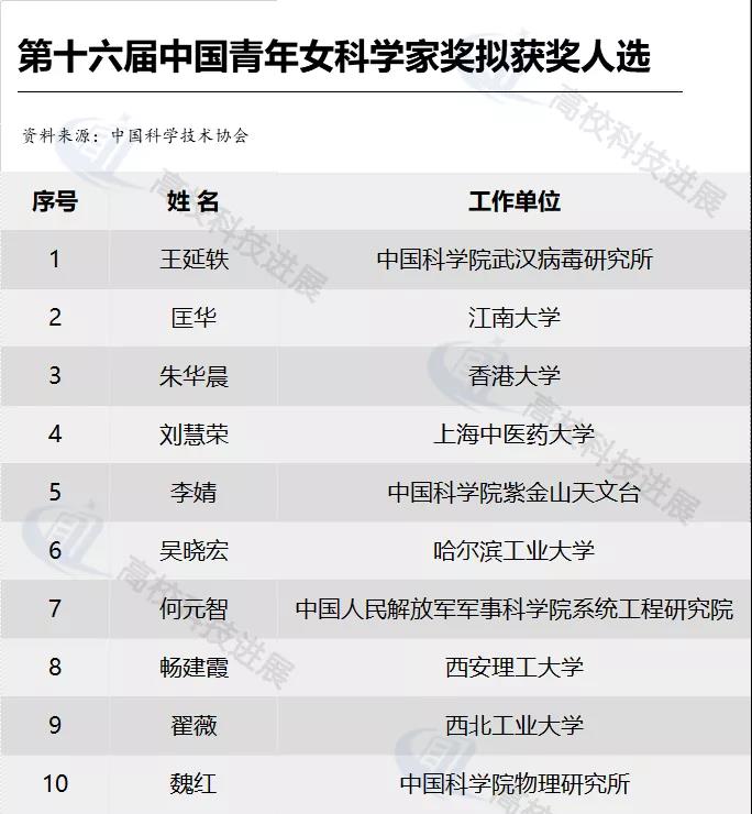 公示名單顯示,江南大學、香港大學、上海中醫(yī)藥大學、哈爾濱工業(yè)大學、西安理工大學、西北工業(yè)大學等6所高校,各有1位女科學家入圍第十六屆“中國青年女科學家獎”擬獲獎人選,她們分別是匡華教授、朱華晨教授、劉慧榮研究員、吳曉宏教授、暢建霞教授、翟薇教授。擬獲獎人選中,有多位女科學家曾獲得“教育部新世紀優(yōu)秀人才支持計劃”或“ 國家自然科學基金委杰出青年基金”的支持。
