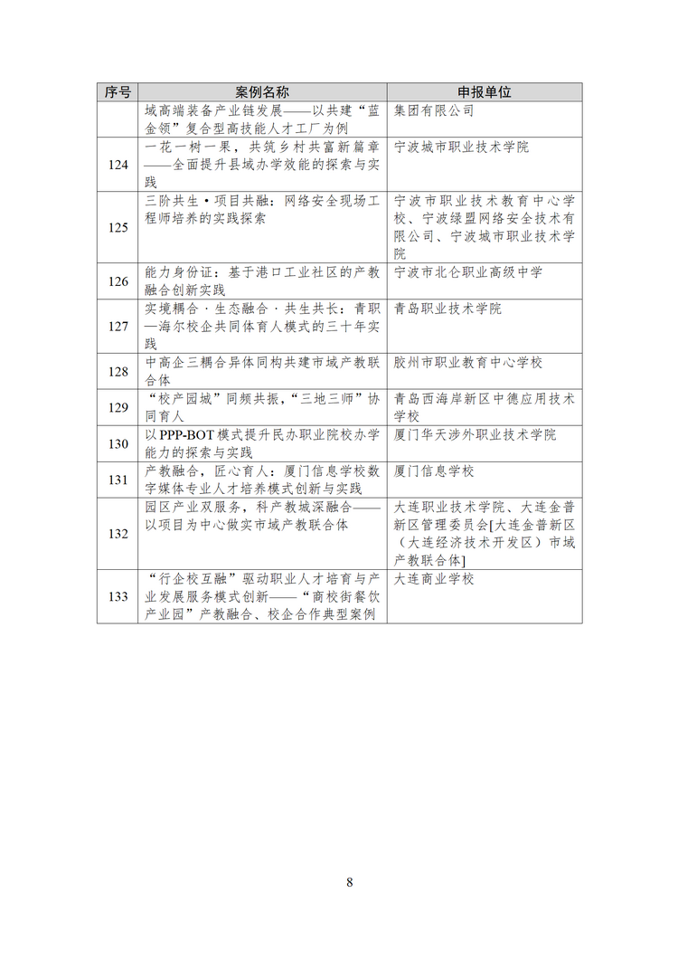根據(jù)《關于征集產(chǎn)教融合、校企合作典型案例的通知》要求,在各省級教育行政部門、各計劃單列市教育局推薦的基礎上,經(jīng)資格審查、專家評議等程序,擬確定133個產(chǎn)教融合、校企合作典型案例(排名不分先后,名單見附件),現(xiàn)予以公示,公示期為2024年12月10日至12月16日。