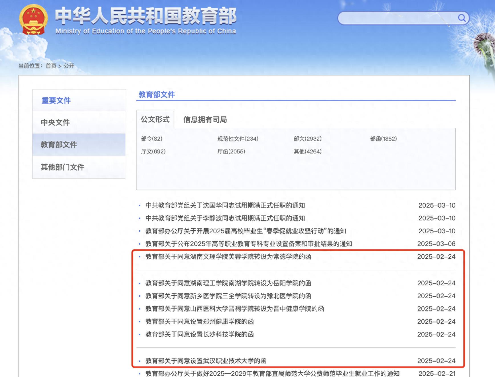近日,教育部官網發(fā)布一批同意設置新大學的函,同意湖南文理學院芙蓉學院轉設為常德學院,湖南理工學院南湖學院轉設為岳陽學院,新鄉(xiāng)醫(yī)學院三全學院轉設為豫北醫(yī)學院,山西醫(yī)科大學晉祠學院轉設為晉中健康學院,設置鄭州健康學院,設置長沙科技學院,設置武漢職業(yè)技術大學。