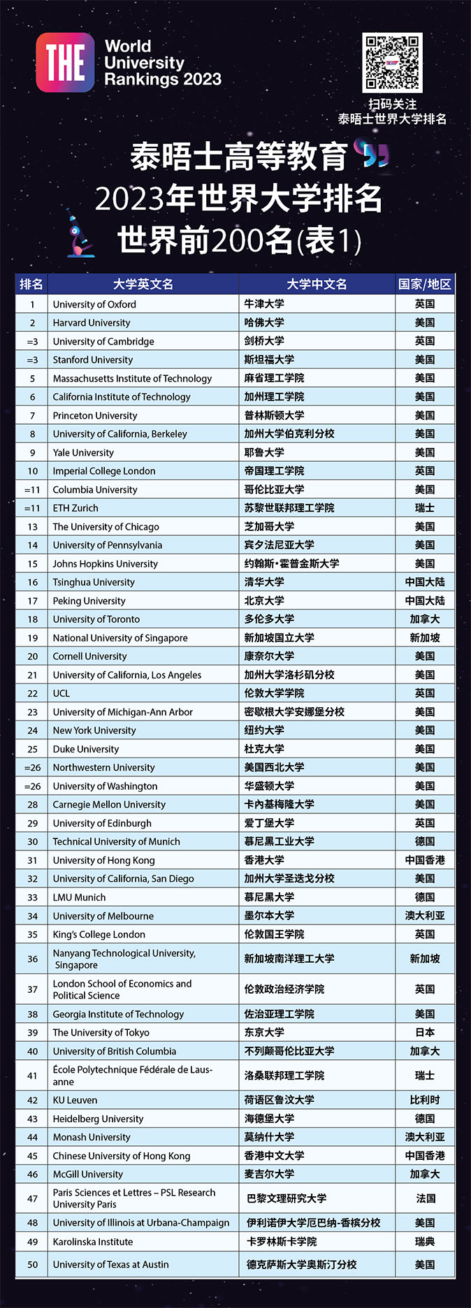 復旦大學(第51位)以及上海交通大學(第52位)排名均有所上升,進一步逼近世界50強。