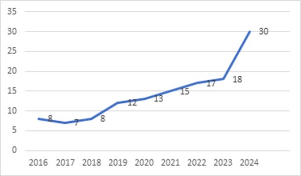 2016年至2024年中國(guó)大陸高校進(jìn)入泰晤士高等教育世界大學(xué)排名世界前400名的高校數(shù)量趨勢(shì)
