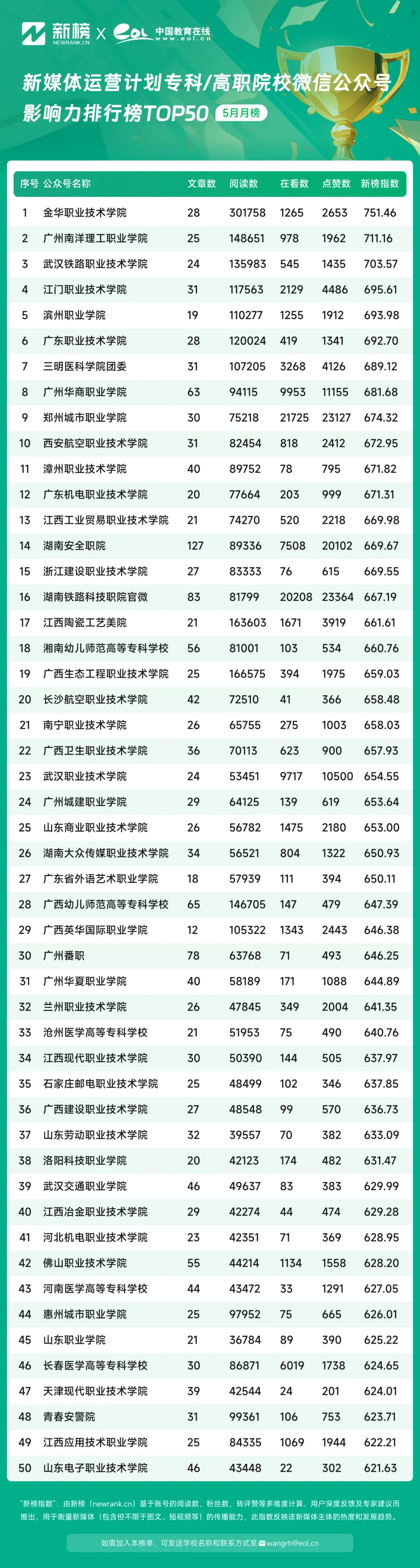 5月,中國教育在線新媒體運營計劃高職??圃盒N⑿殴娞栍绊懥ε判邪馮OP50中,@金華職業(yè)技術(shù)學(xué)院公眾號憑借751.46的新榜指數(shù)躍居榜單第一,@廣州南洋理工職業(yè)學(xué)院憑借711.16的影響力指數(shù)位居第二,@武漢鐵路職業(yè)技術(shù)學(xué)院以703.57的影響力指數(shù)位居榜單第三。