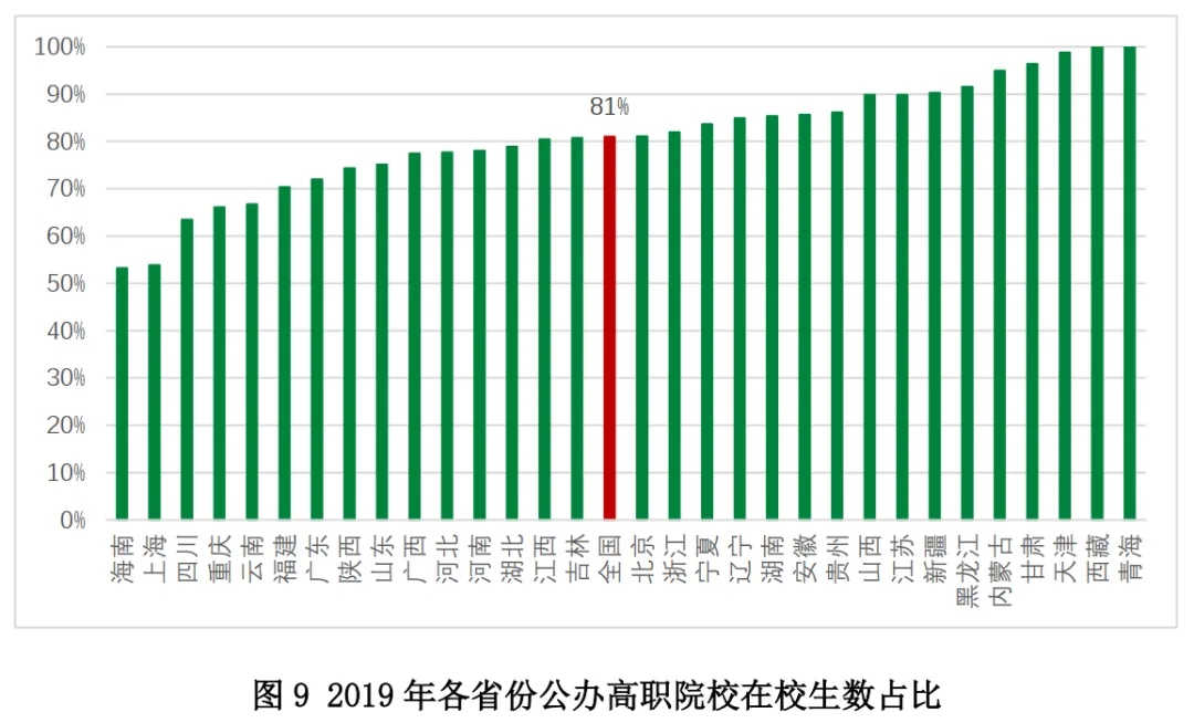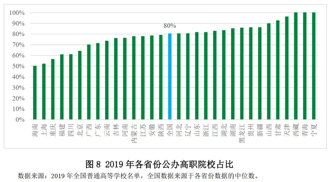2019年,我國高等職業(yè)院校中公辦學(xué)校占比的中位數(shù)為80%,各省份公辦高職學(xué)校比例差異較大。西部和中部地區(qū)的公辦高職學(xué)校比例較高,其中西藏、青海、寧夏等省份的高職學(xué)校全部為公辦;山西、甘肅等省份的公辦高職院校比例也已超過90%;東部和東北地區(qū)的公辦高職學(xué)校比例相對較低,其中海南、上海等省份的公辦院校比例低于60%。(圖8)