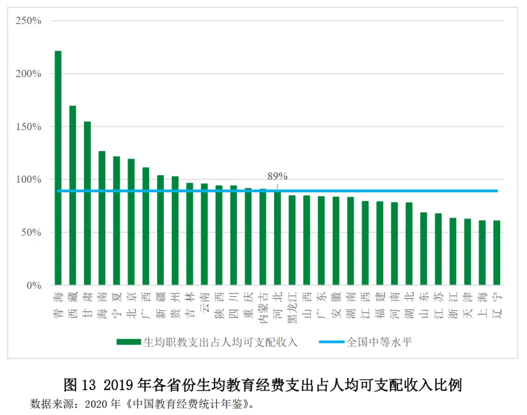 在經(jīng)費(fèi)投入的充足性方面,與各省份人均可支配收入相比,全國高職院校生均教育經(jīng)費(fèi)支出的中位數(shù)約為各省人均可支配收入的89%。具體到各省份,其中,青海、西藏、甘肅的生均教育經(jīng)費(fèi)支出占人均可支配收入的比例較高,均超過150%,高等職業(yè)教育投入水平相對較高。山東、江蘇、浙江、天津、上海、遼寧的生均教育經(jīng)費(fèi)支出占人均可支配收入的比例均低于70%,高等職業(yè)教育投入水平相對較低。(注:根據(jù)世界各國的高等教育生均經(jīng)費(fèi)占人均GDP即通常所謂生均經(jīng)費(fèi)指數(shù)的分析,由于規(guī)模效益等因素,生均經(jīng)費(fèi)指數(shù)在高等教育較不發(fā)達(dá)的國家存在較高的現(xiàn)象,我國也是隨著高等教育的發(fā)展,生均經(jīng)費(fèi)指數(shù)從超過100%逐步降低。相同的因素可能可以解釋此處的高職研究發(fā)現(xiàn),當(dāng)然嚴(yán)謹(jǐn)?shù)挠懻撚写M(jìn)一步的實證分析。)(圖13)