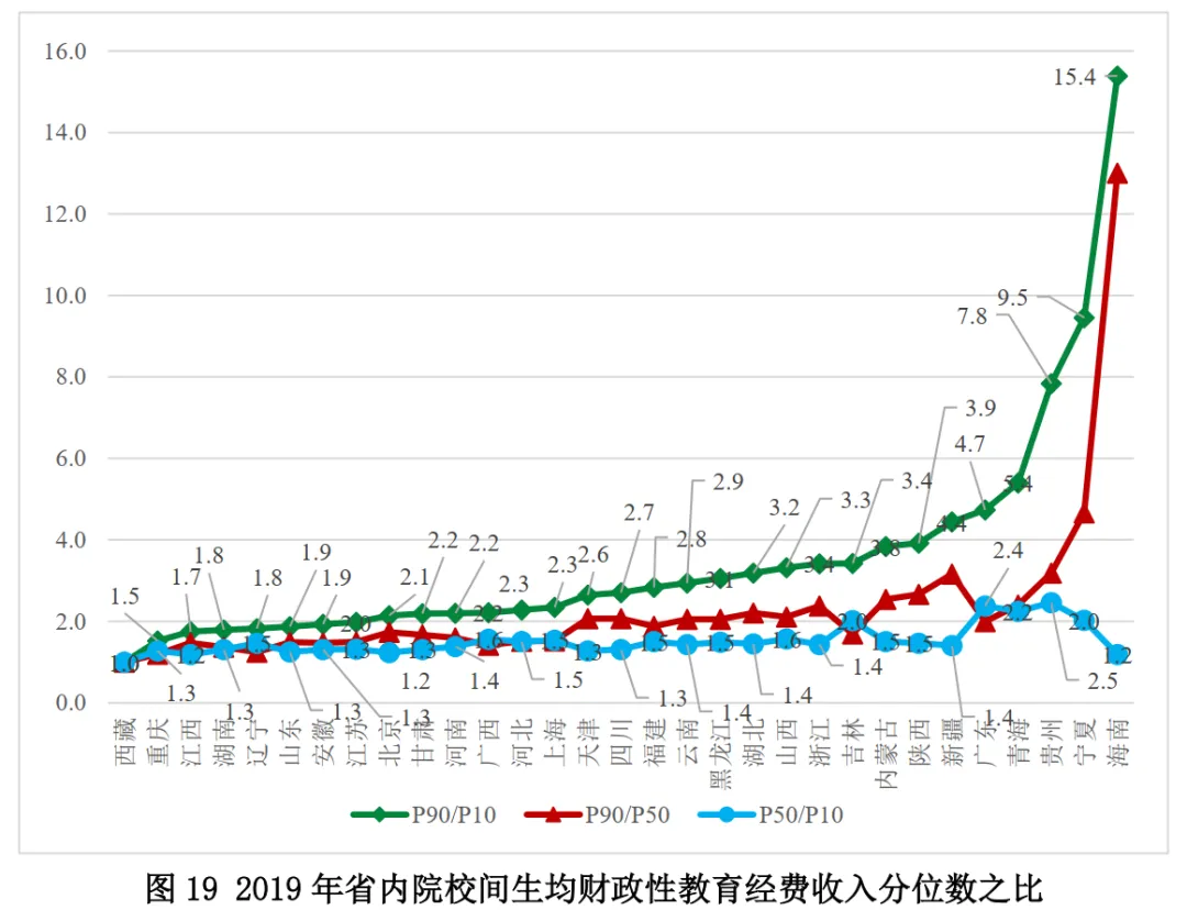 從2019年各省份生均財政性教育經(jīng)費(fèi)收入的分位數(shù)之比來看:(1)西藏、重慶、江西、湖南的省內(nèi)均衡性位居前列;(2)海南、寧夏、貴州、青海位居最末。其中,海南和寧夏的P90/P10分別為15.4和9.5,且省內(nèi)生均財政性教育經(jīng)費(fèi)收入最高的90分位數(shù)學(xué)校與居中的50分位數(shù)學(xué)校差異,遠(yuǎn)大于省內(nèi)生均財政性教育經(jīng)費(fèi)收入居中的50分位數(shù)學(xué)校與最低的10分位數(shù)學(xué)校差異。(圖19)這意味著生均財政性教育經(jīng)費(fèi)收入處于前50%位置的高校間差異是造成兩個省份,特別是海南省省內(nèi)生均財政性教育經(jīng)費(fèi)收入差異的主要原因。