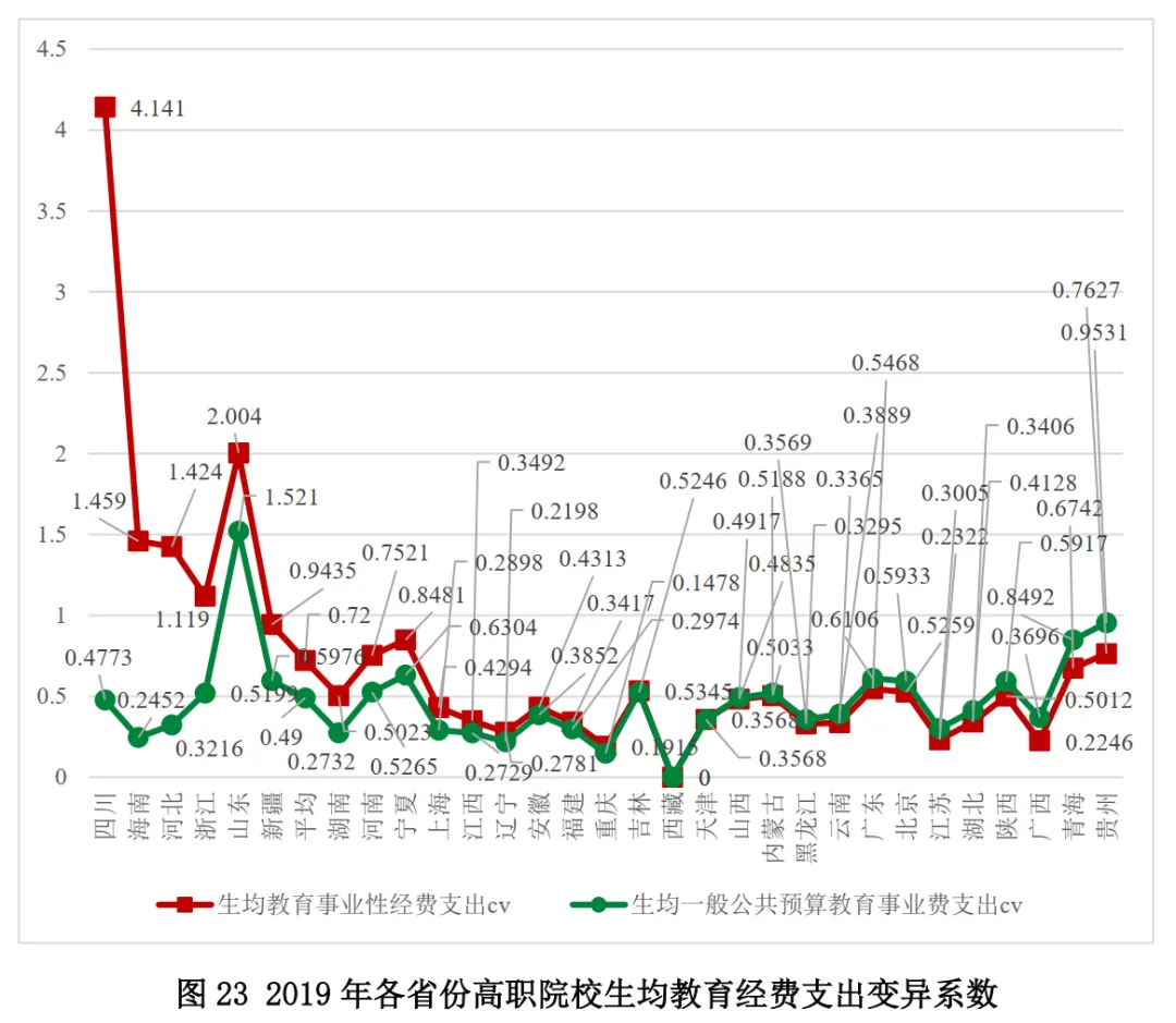 相較而言,2019年我國各省份內(nèi)部高職院校生均教育事業(yè)性經(jīng)費(fèi)支出的變異程度要大于生均一般公共預(yù)算教育事業(yè)費(fèi)支出的變異程度,前者變異系數(shù)均值為0.72,后者的變異系數(shù)均值為0.49。就生均教育事業(yè)性經(jīng)費(fèi)支出的變異系數(shù)而言,四川(4.14)、山東、海南、河北、浙江的變異系數(shù)較大,重慶最小(0.19);就生均一般公共預(yù)算教育事業(yè)費(fèi)支出的變異系數(shù)而言,山東(1.52)、甘肅、貴州、青海的變異系數(shù)較大,重慶最小(0.15)。(圖23)