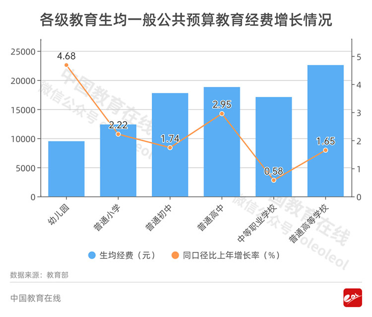 其中,增長最快的是幼兒園,比上一年增長4.68%,達到了9505.84元。普通小學(xué)為12380.73,同比增長2.22%,普通初中為17772.06,同比增長1.74%,普通高中18808.71,同比增長2.95%,中職與普通高校增長最低,分別為17095.26與22586.42,僅增長0.58%和1.65%。