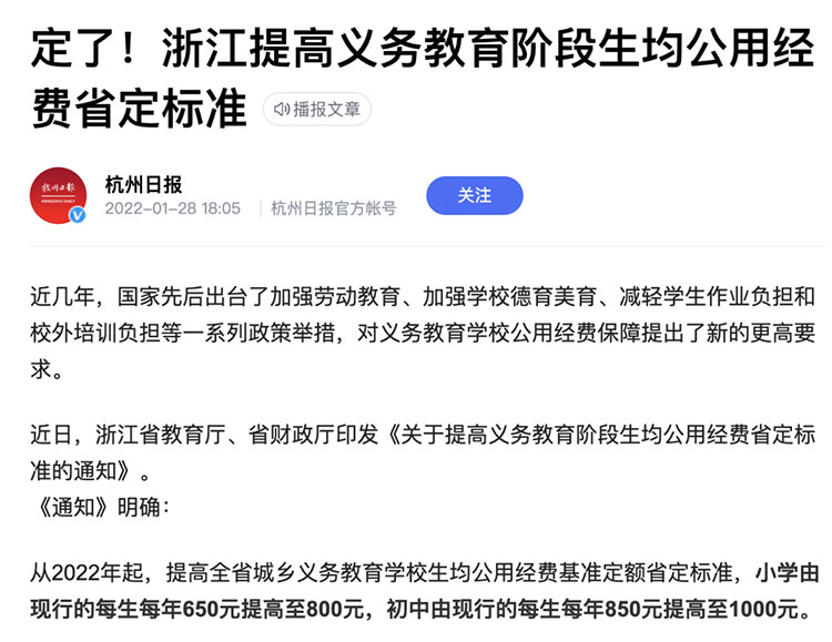 近期,浙江省、青島市等相繼發(fā)布提高義務(wù)教育學(xué)校生均公用經(jīng)費標(biāo)準的通知,浙江從2022年起,小學(xué)由現(xiàn)行的每生每年650元提高至800元,初中由現(xiàn)行的每生每年850元提高至1000元。青島明確從2022年12月起,分別由小學(xué)每生每年900元、初中每生每年1100元,統(tǒng)一提高至小學(xué)每生每年1300元、初中每生每年1700元。