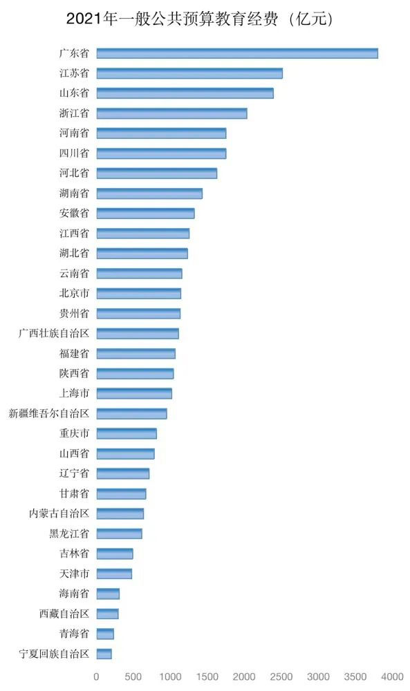 2021年廣東省一般公共預(yù)算教育經(jīng)費高達3793.37億元,遙遙領(lǐng)先于其他省份。同年廣東省GDP總量達到12.44萬億元,連續(xù)33年居全國第一,廣東省作為全國首個也是唯一一個GDP跨上12萬億元臺階的省份,發(fā)達的經(jīng)濟足以支撐其較高的教育經(jīng)費。